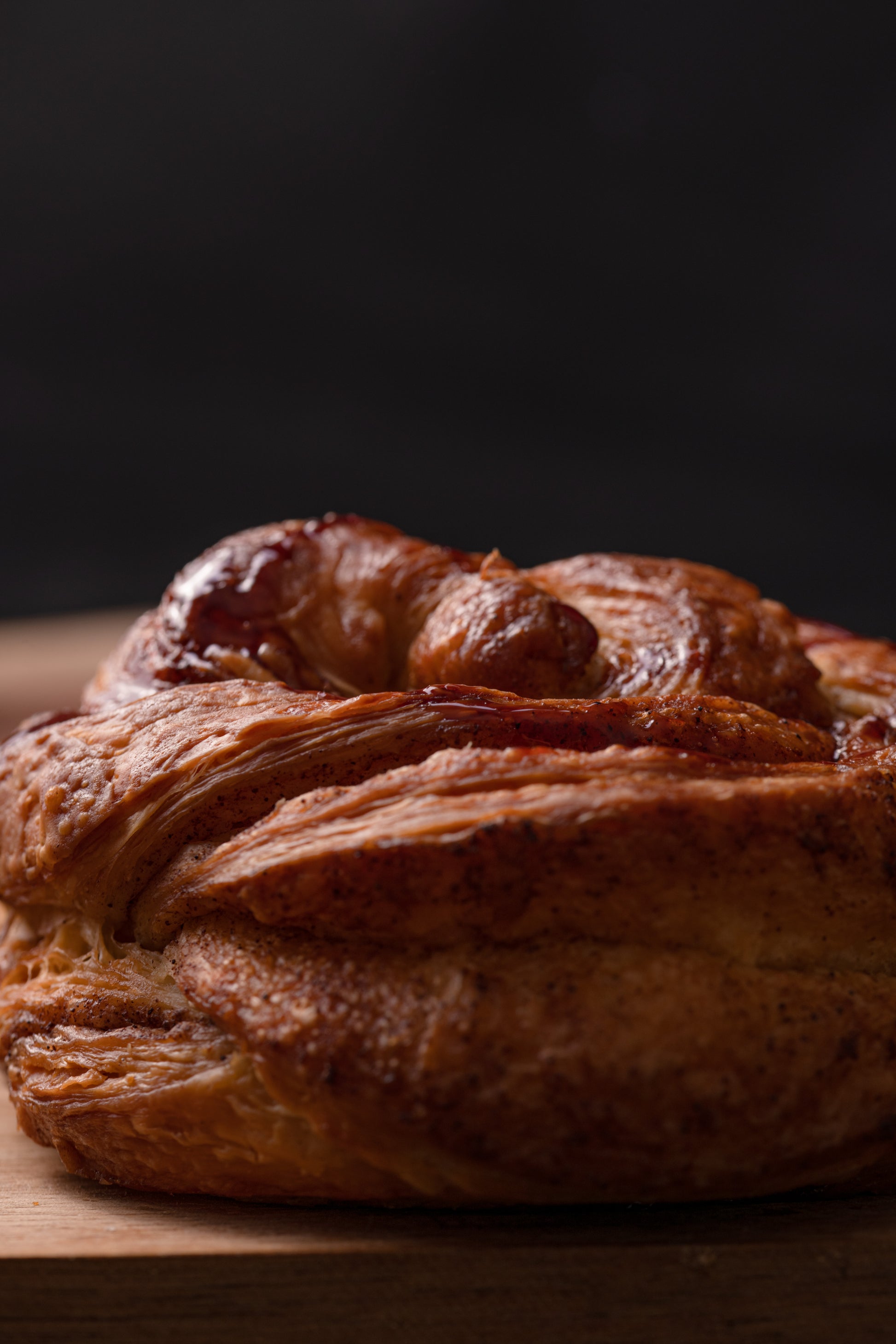 Speltos miltų cinamoninė bandelė su datulių glajumi.