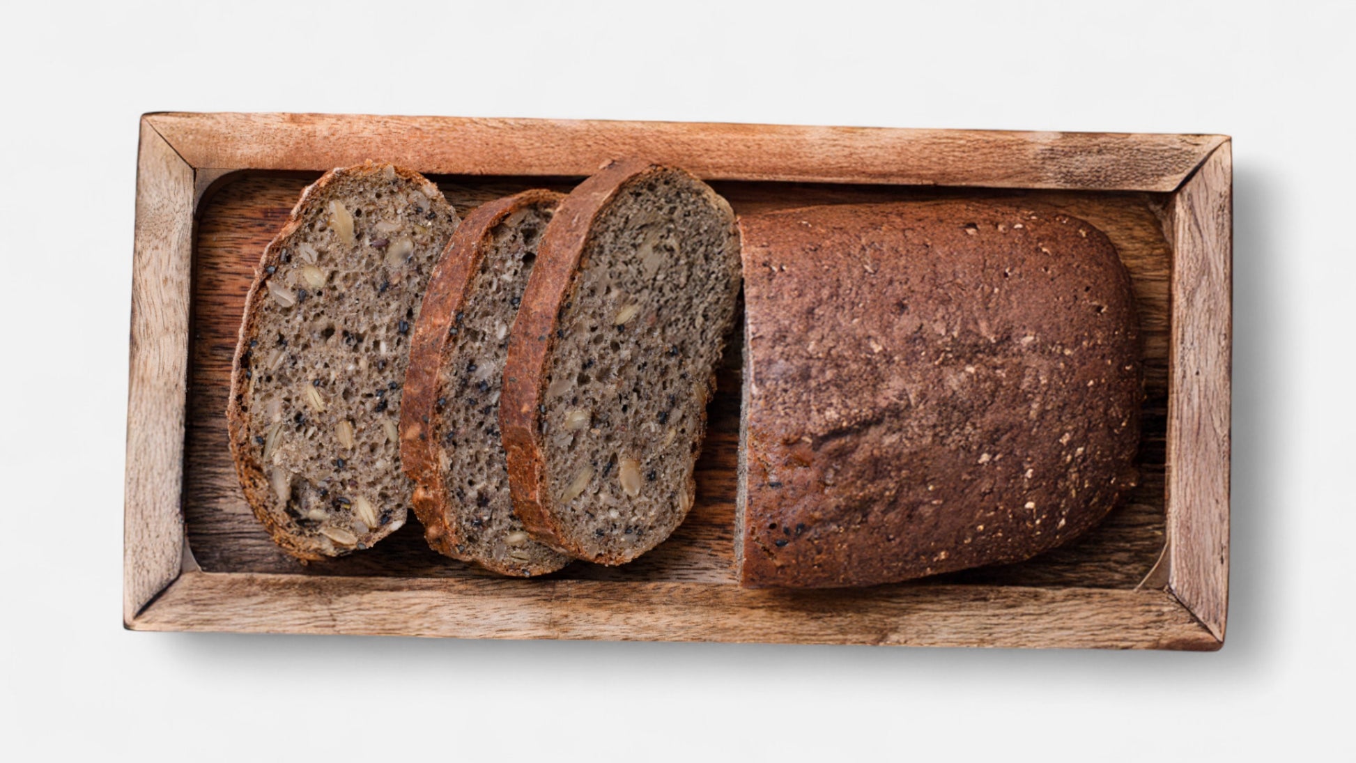 Tamsi duona be glitimo, pagaminta iš grikių miltų, praturtinta sėklomis.
