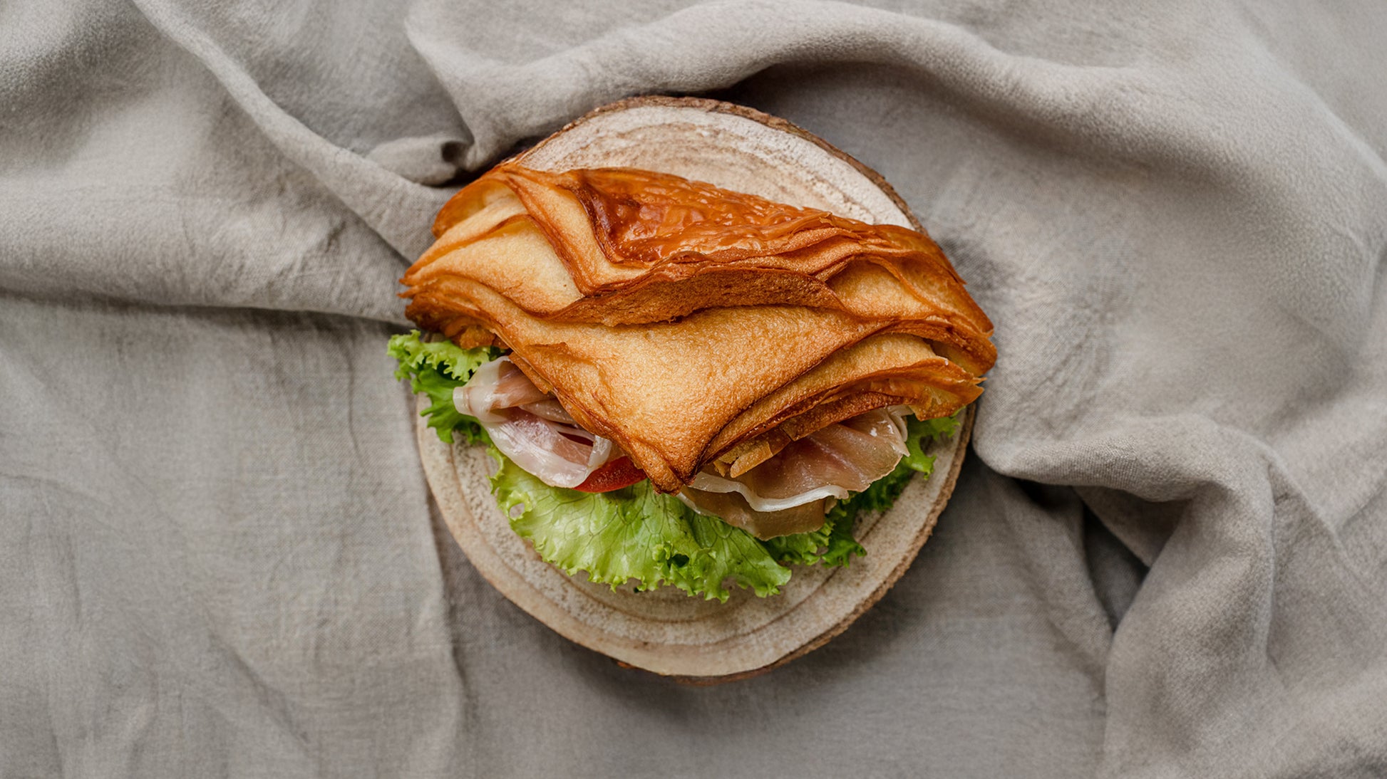 Speltos miltų kruasanas su serano kumpiu, trumais, pomidorais, salotomis bei kreminiu sūriu be laktozės ir žolelių aliejumi.