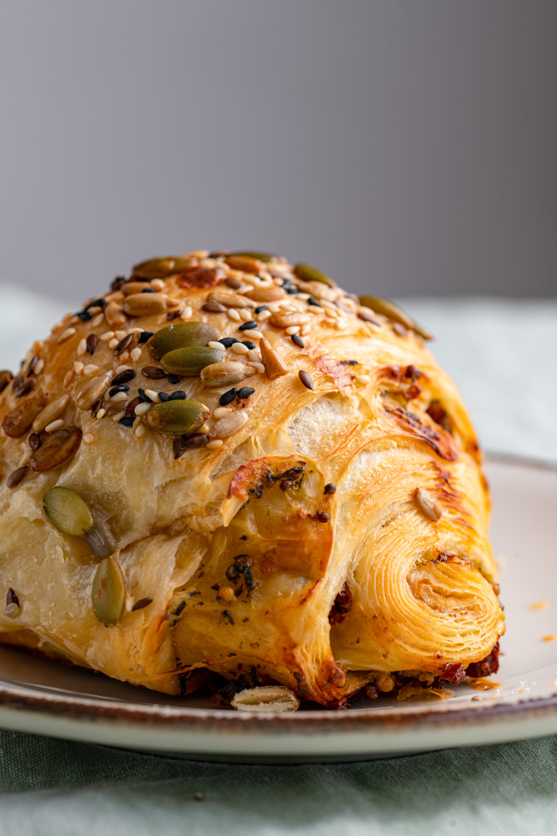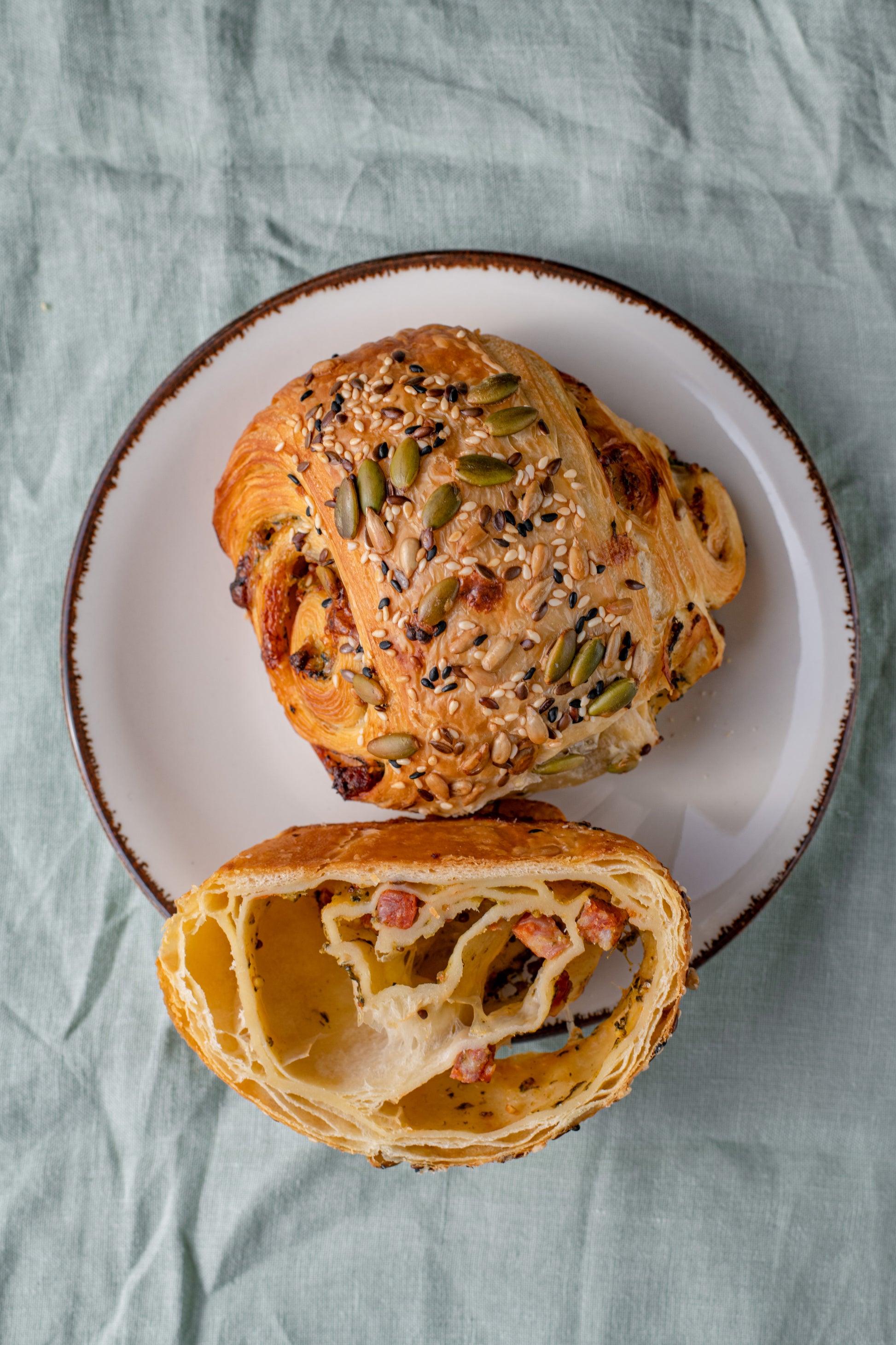 Speltos miltų sluoksniuotos tešlos bandelė su chorizo, čederiu bei sėklomis.