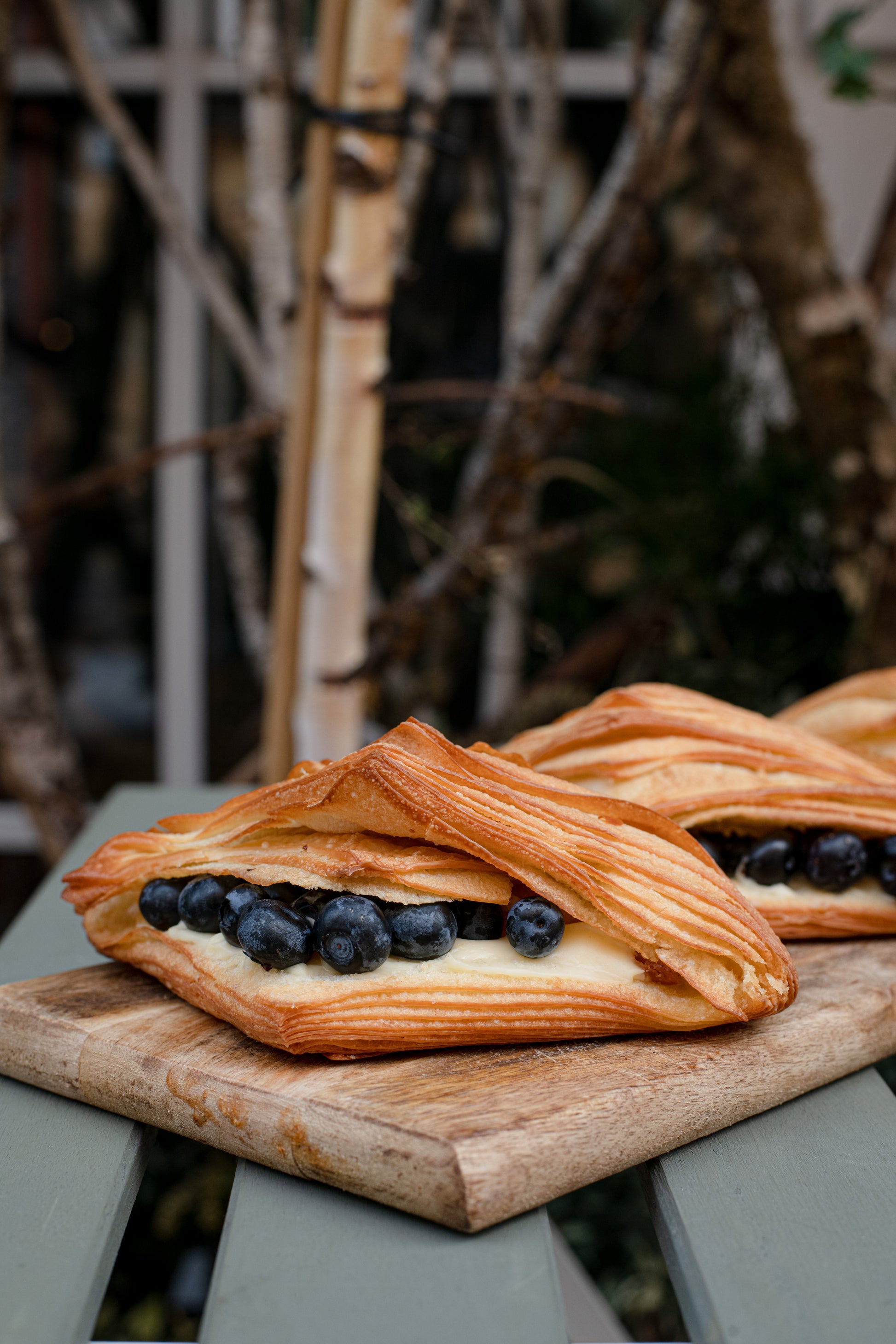 Speltos miltų kruasanas pagardintas plikytu kremu bei šviežiomis šilauogėmis.